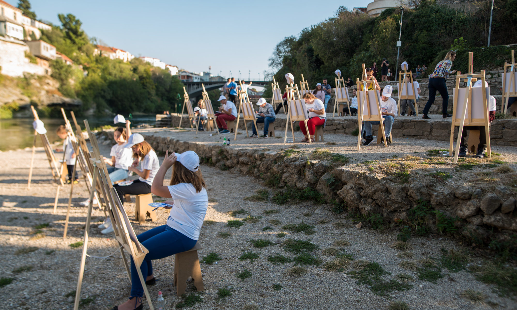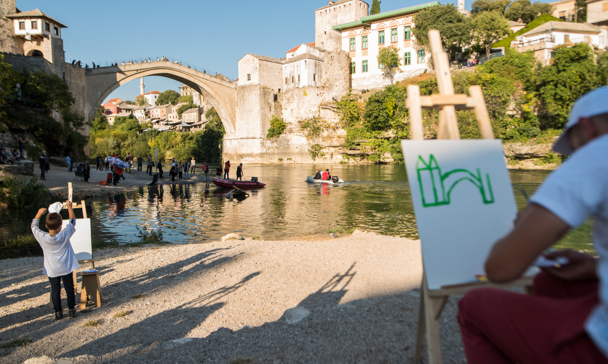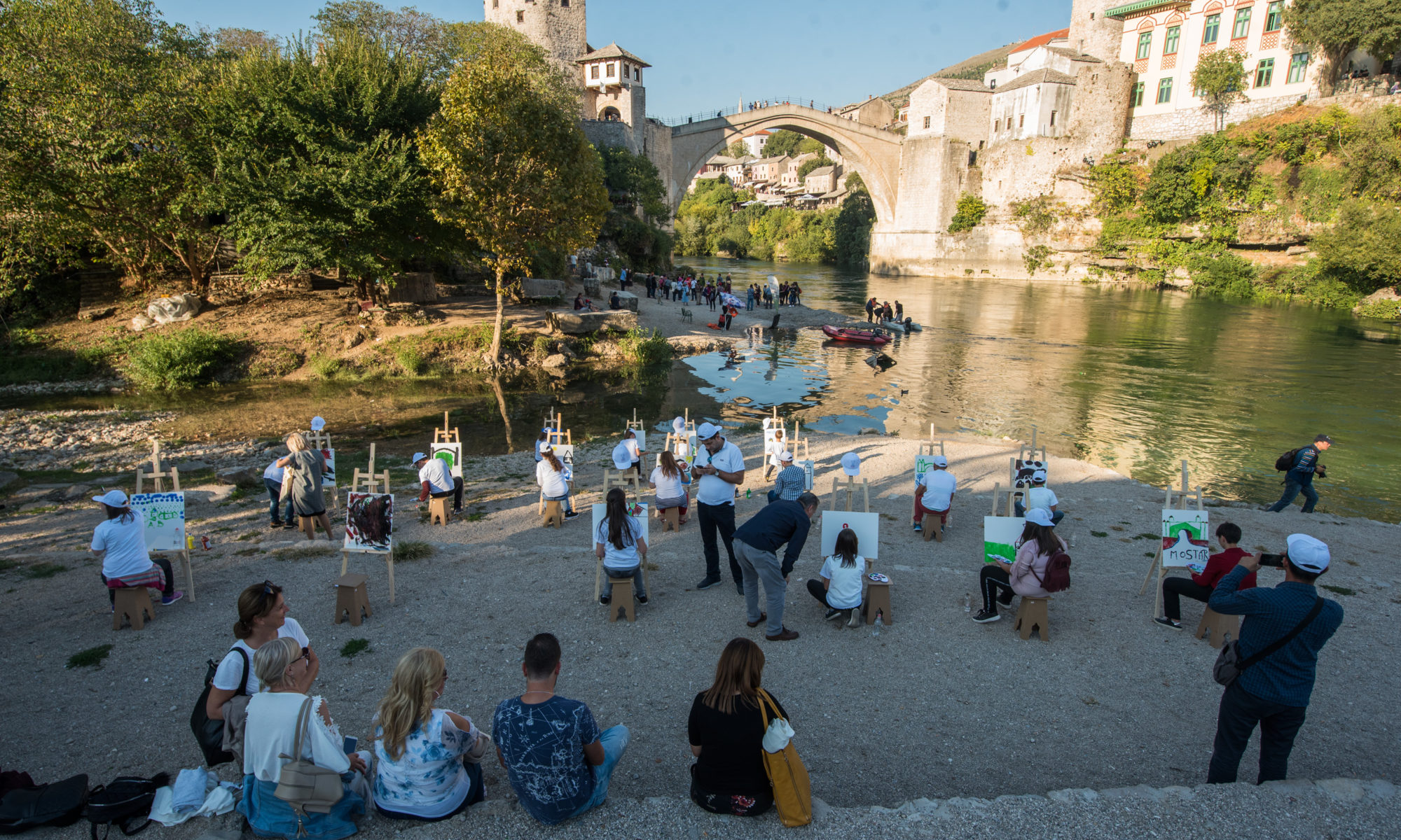 Uobičajeni prizor na Starom mostu u Mostaru, a koji barem za sunčanih dana podrazumijeva okupljene turiste u iščekivanju skoka nekog od mostarskih skakačkih avanturista, konkurenciju je dobio u jučerašnjem likovnom ateljeu na otvorenom.
