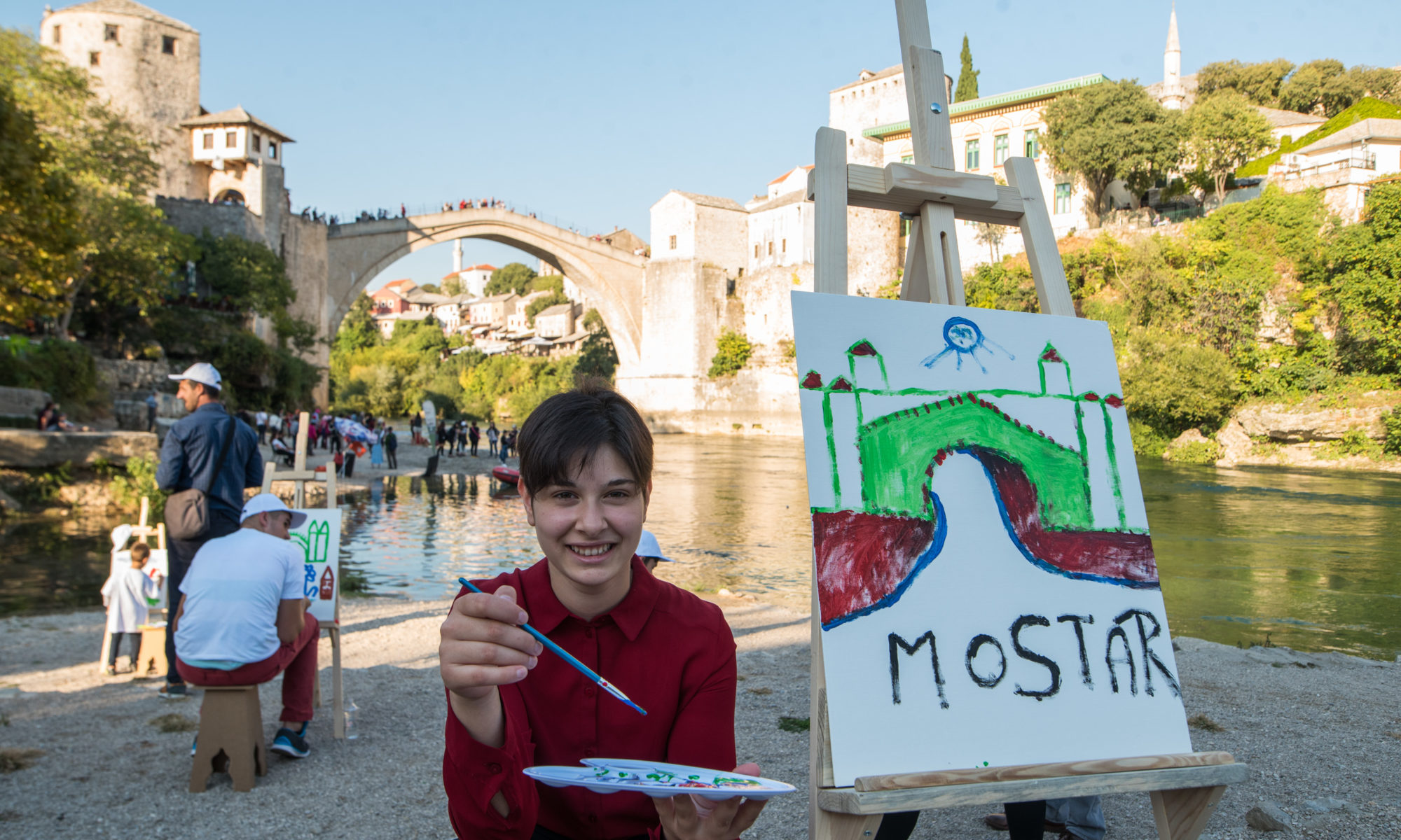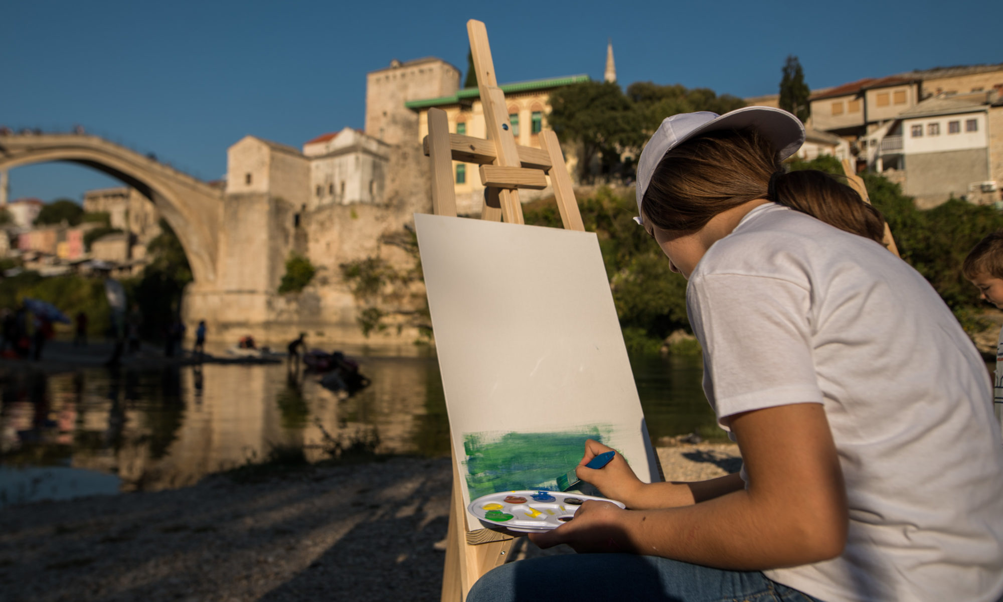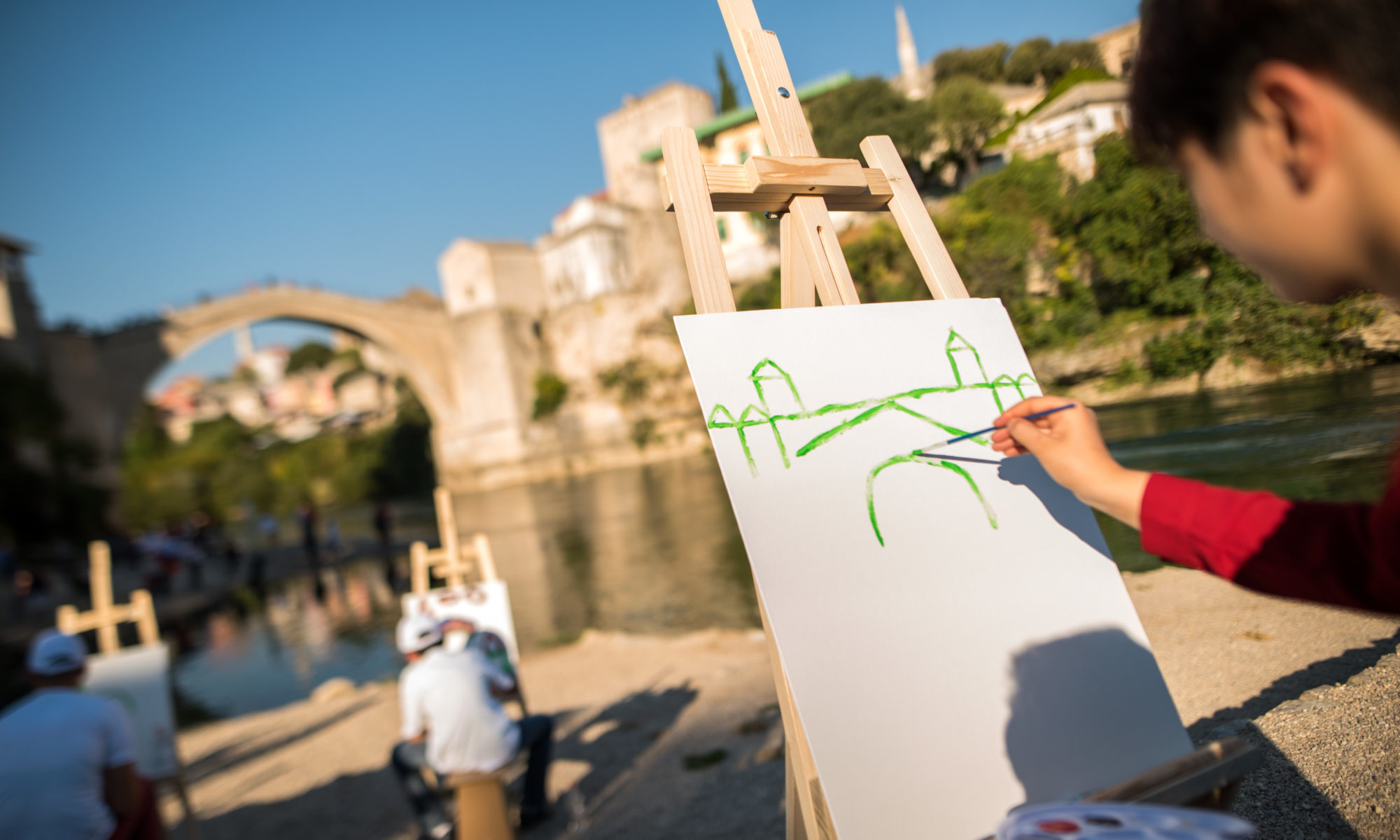 Uobičajeni prizor na Starom mostu u Mostaru, a koji barem za sunčanih dana podrazumijeva okupljene turiste u iščekivanju skoka nekog od mostarskih skakačkih avanturista, konkurenciju je dobio u jučerašnjem likovnom ateljeu na otvorenom.